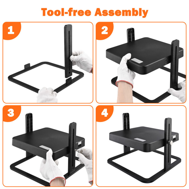 Tool-free Assembly - No tools required for easy assembly, just insert the stands into the base, put the heating plate between 2 stands, fasten the plate with screws and tighten