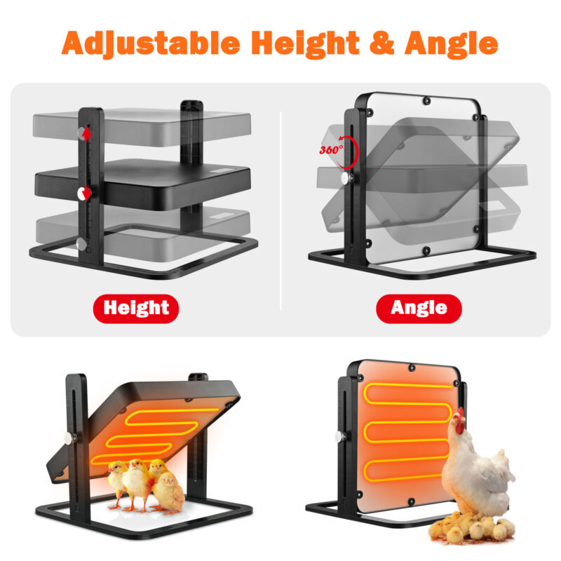 Adjustable Height & Angle - Features stands & adjustable knobs on 2 sides of the heating plate for easily moving the plate up and down, you can increase the height of the heating plate as the chick grows; Allows 360-degree free rotation to hold the plate upright or at any position you like