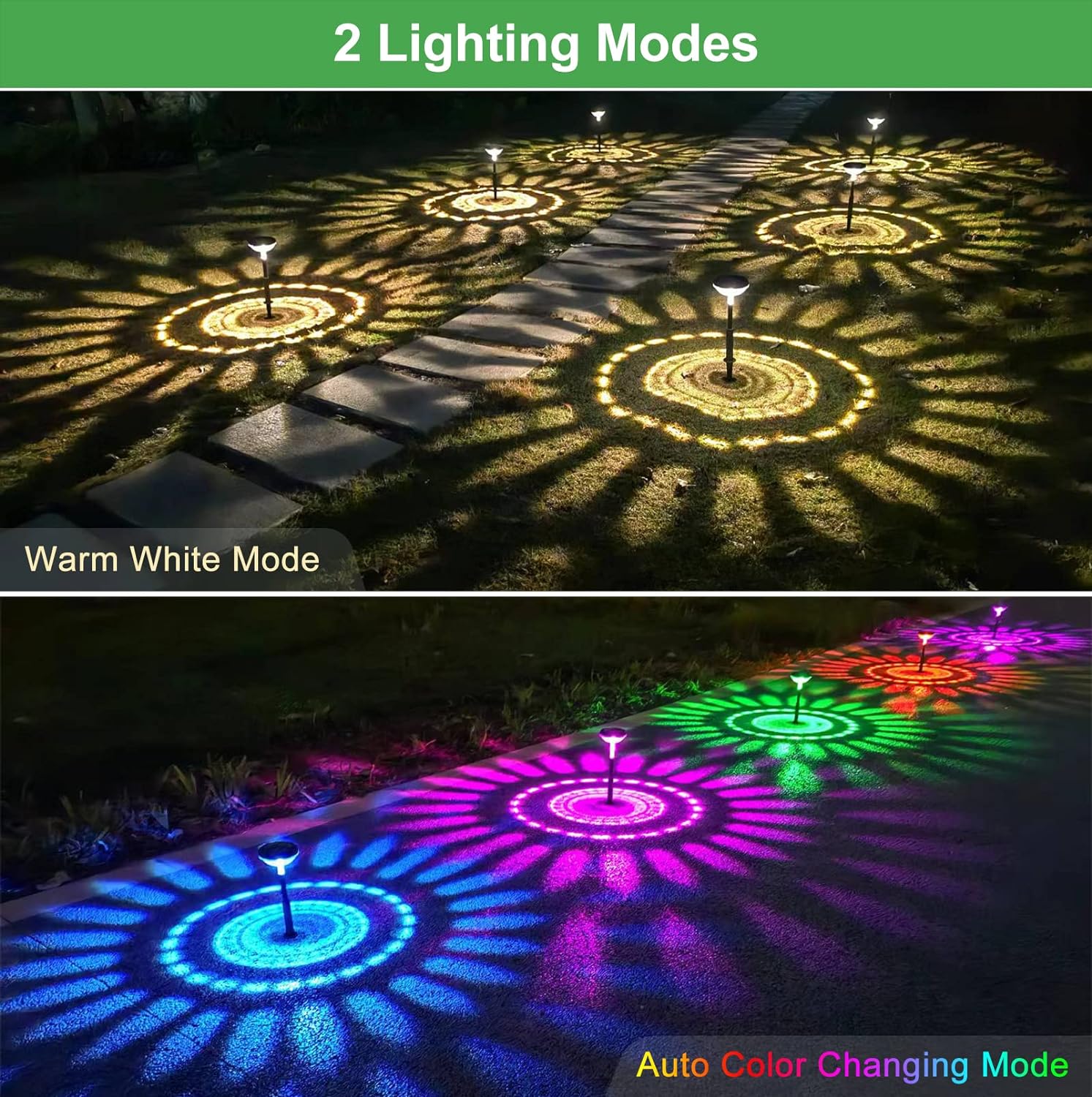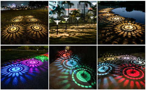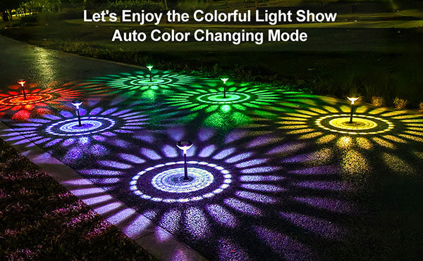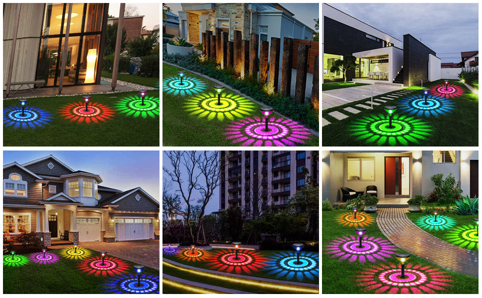 【2 Lighting Mode & High-Brightness】Outdoor walkway lights solar powered are designed with 2 modes(Multicolor mode & Warm White mode)(9-13hrs), which use high-power LED lamp beads and high transmittance lampshade makes our lights brighter than ordinary solar path lights, which can be more perfect to project colorful sunflower pattern, you can decorate and illuminate your garden to make them more beautiful and colorful. (lawn, courtyard, sidewalk, walkway, fence, deck, stairs, flower bed)